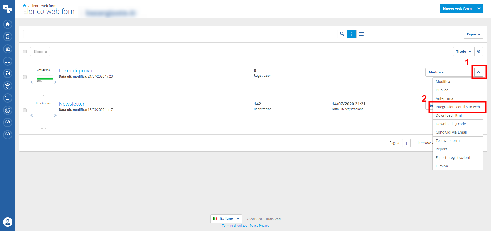 - selezionare la voce "web forms" dalla spalla di sinistra della piattaforma BrainLead